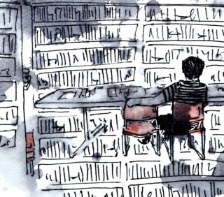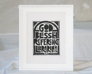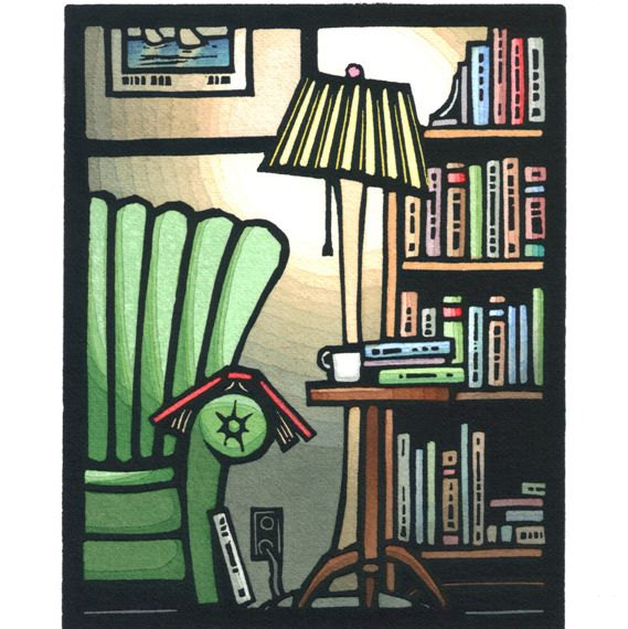 Or, a linocut of a cosy, comfy looking sort of library to settle down in for a good read: