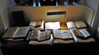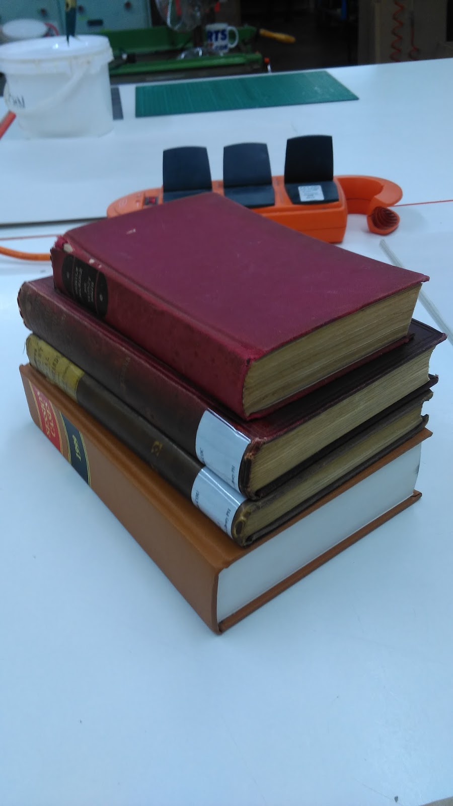 I had four books with issues – two old books that needed their spines/boards replaced or repaired/had sprung overly open and the sewing had started to become loose (and one of those had also suffered from some historic munching by a bookworm on the spine and front board); one that was in danger of having the spine break off, and one modern one that had a single loose page which we wanted advice on refixing properly.