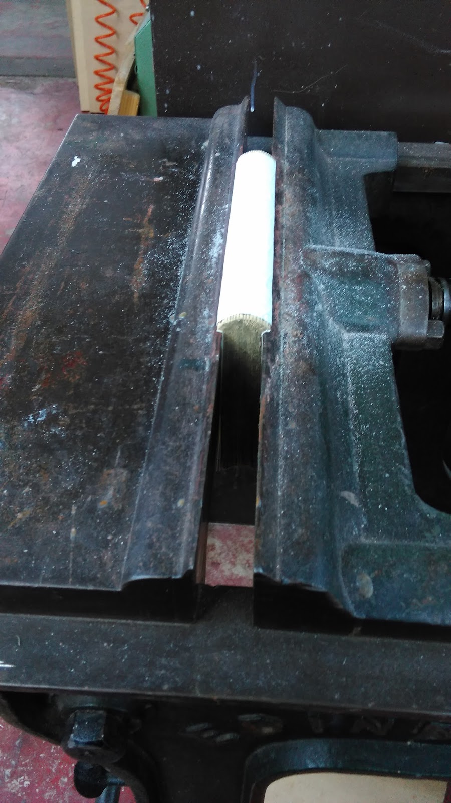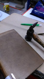 Then, I got to vent some frustrations! The books were held tightly in a heavy duty metal clamp, and the spines needed to be hammered back into the curved shape that a book spine should sit in. So….I got to hit them them with a hammer, yay!