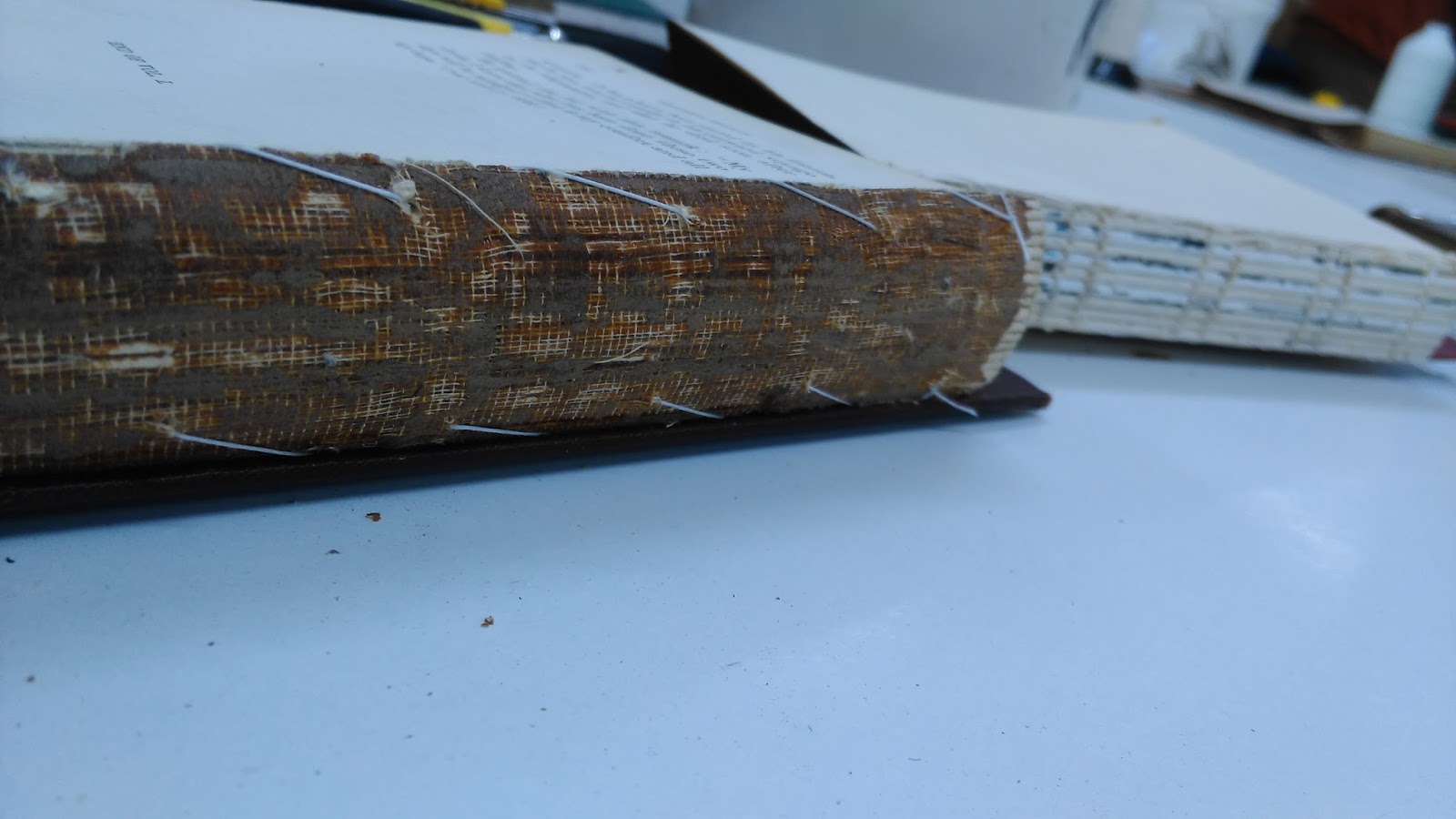 The original spines now needed to be fixed on to the new spine sections, after being trimmed to remove any trailing edges or threads.
