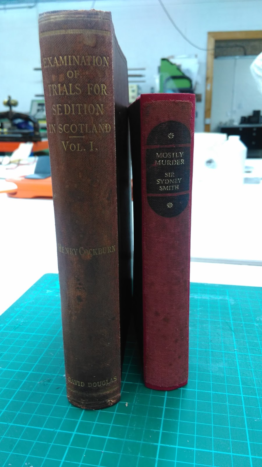 Meanwhile, John had also been advising on how to stop one old book’s (Report of the Trial of the Dynamitards, in case you were curious) spine label from popping off. Turns out, its thick paste. Wipe it on with a sponge, then wipe the excess off, and leave to dry. Voila! Turns out, it also slightly cleans it in the process too – who knew that book was so manky? (not me).