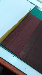 John had chosen a close match in buckram fabric for each original cover, and these needed to be cut to size for each spine. The card for the spine was glued on to the buckram, with overlap at all sides.